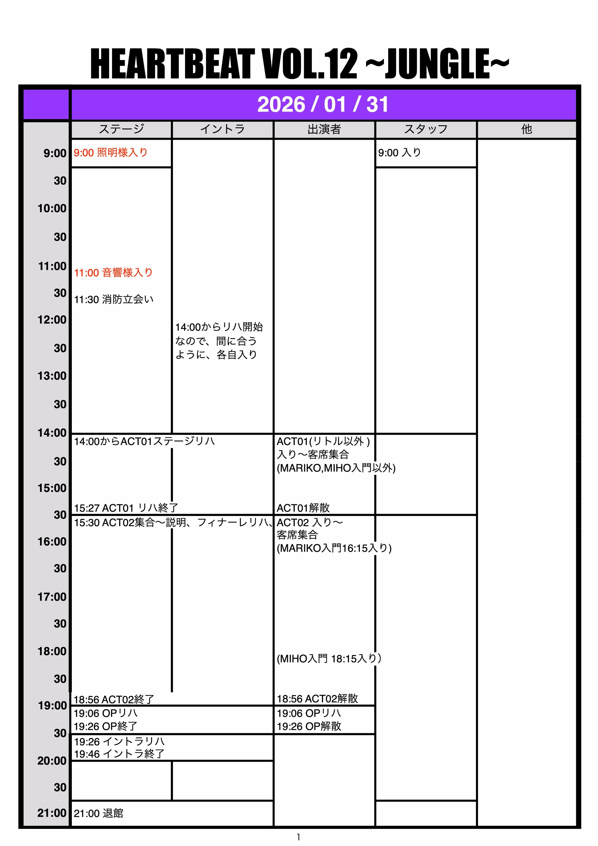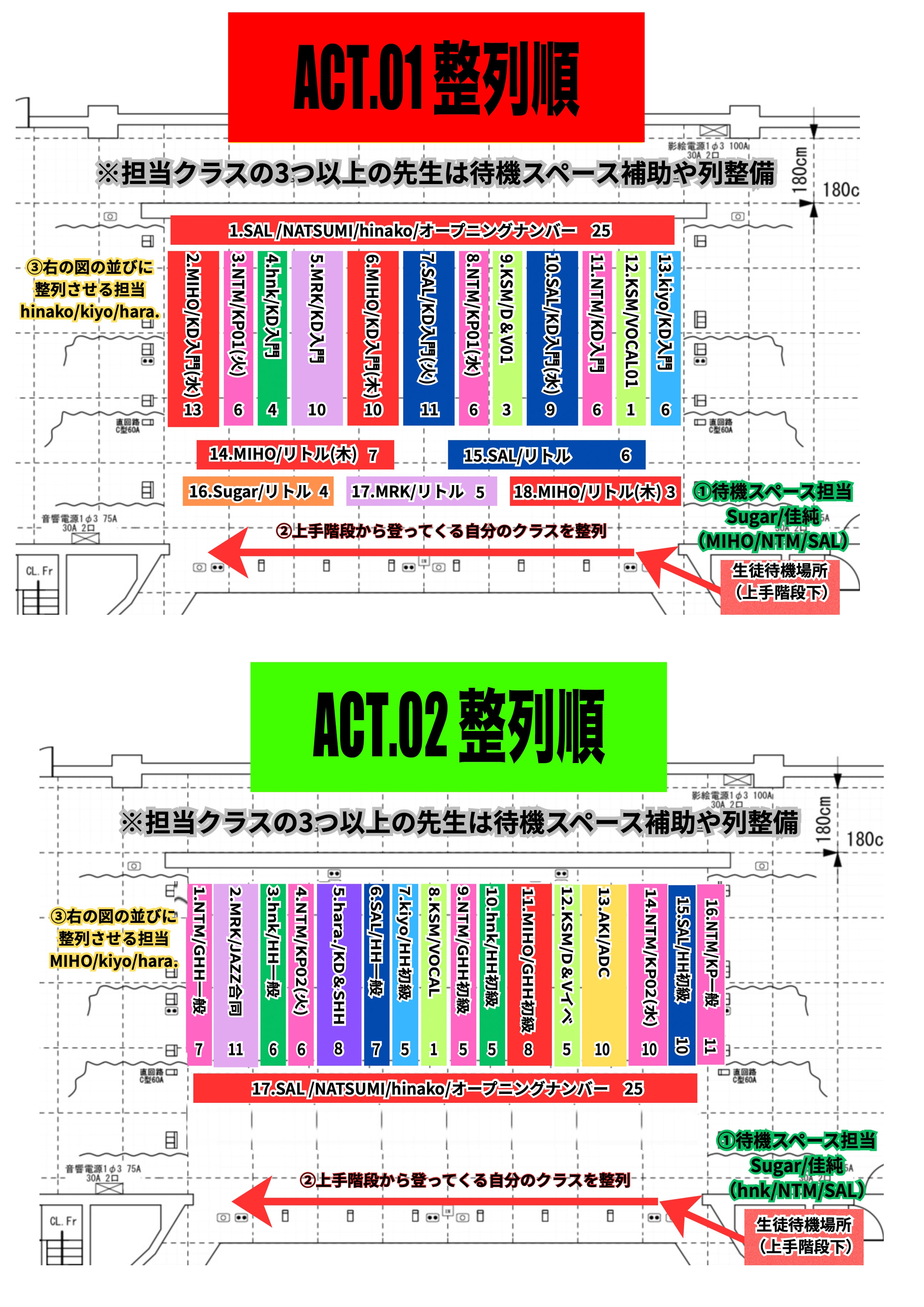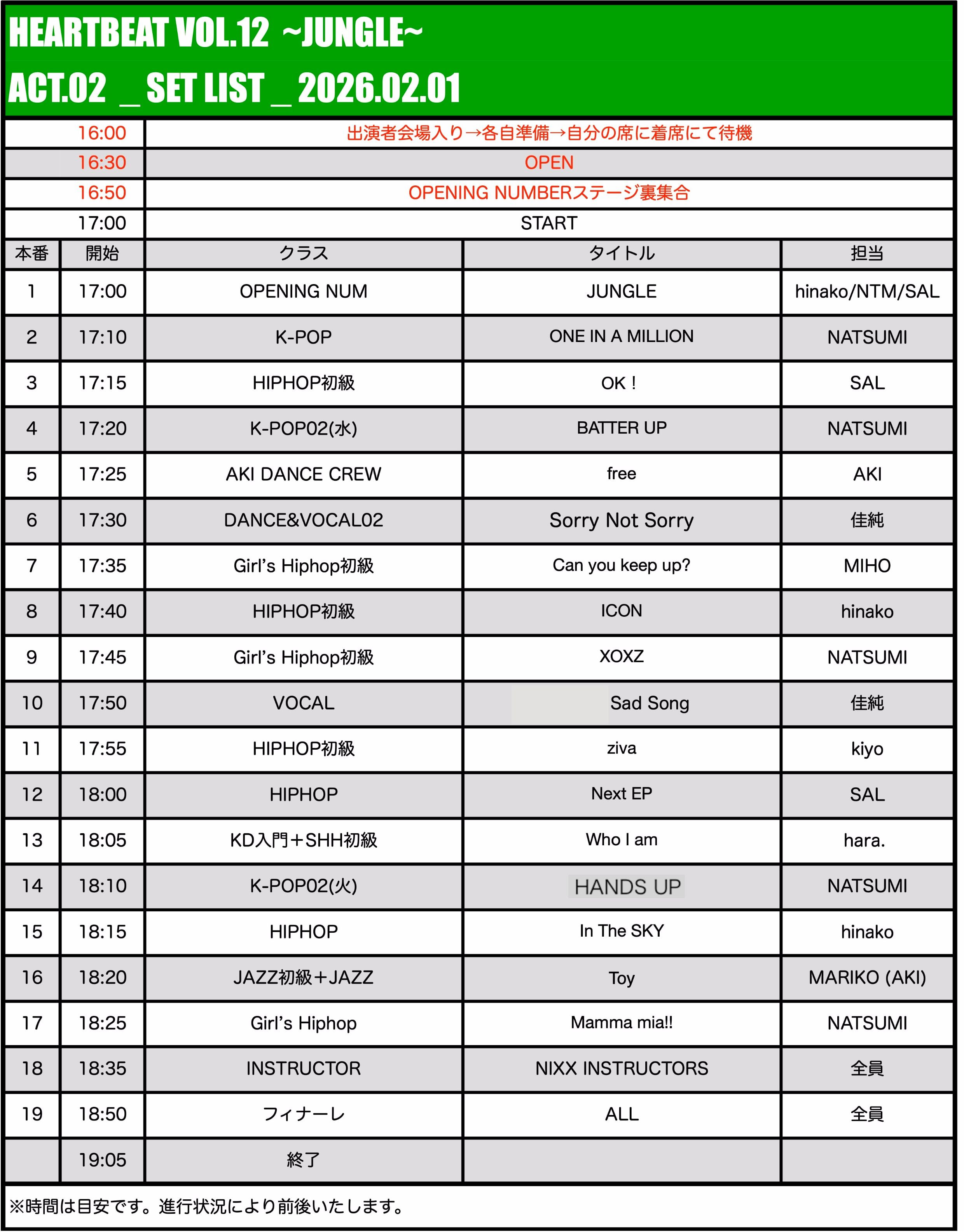 ・今回よりインストラクターには、事前準備のお手伝いはお願いしておりませんので、14時からのステージリハーサルに合わせて各自逆算し入り時間を決めてください。